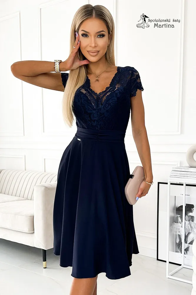 - Tmavě modré midi šaty "Suzette" s šifonovou sukní a krajkovým živůtkem