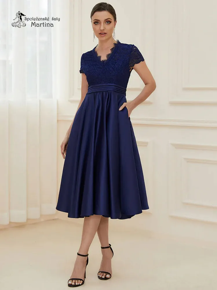 Tmavě modré midi společenské šaty "Tamson" s krajkovým živůtkem a kapsami - vel. 342 240 Kč/ ks1 851 Kč bez DPH