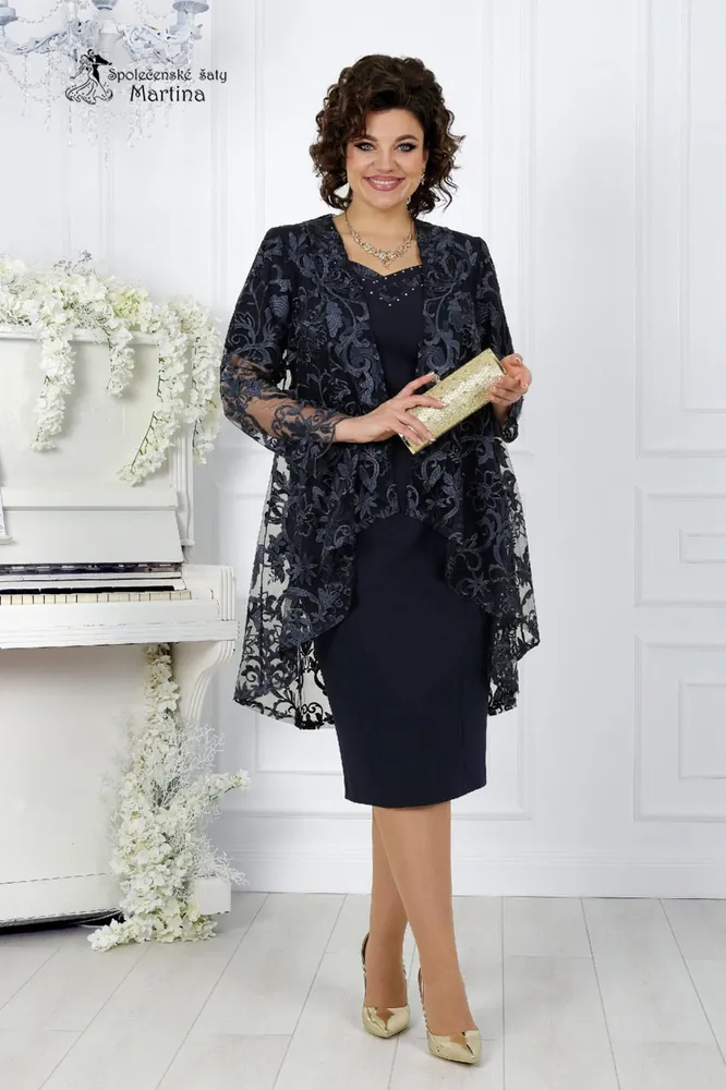 - Tmavě modré pouzdrové šaty s krajkovým kardiganem "Dominique"