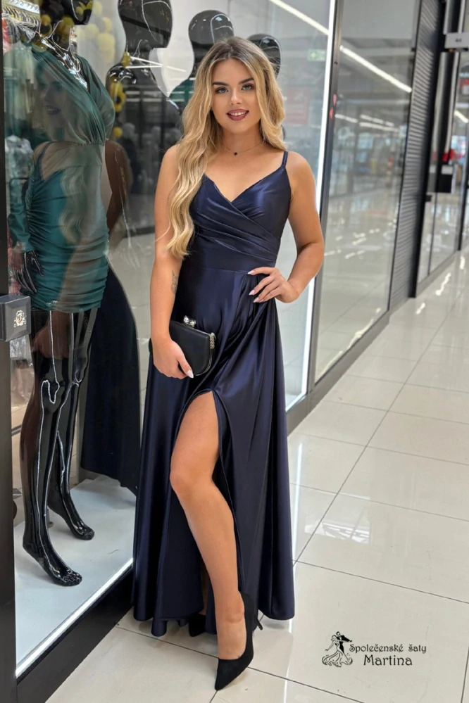 Tmavě modré saténové společenské šaty "Stella" s rozparkem a překládaným živůtkem - vel. 322 340 Kč/ ks1 934 Kč bez DPH
