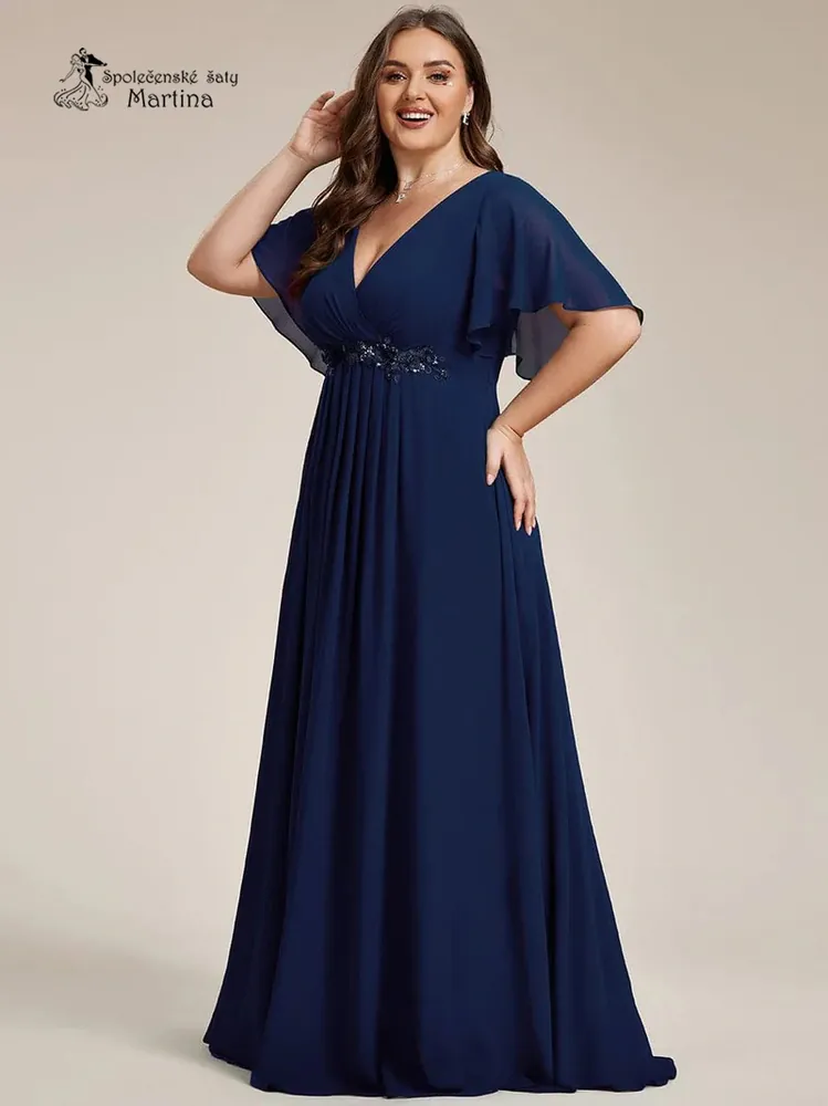 - Tmavě modré šifonové šaty "Pandora" s volným rukávem a aplikací v pase