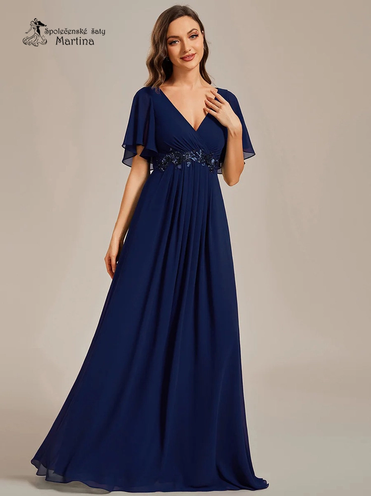 3. Tmavě modré šifonové šaty "Pandora" s volným rukávem a aplikací v pase