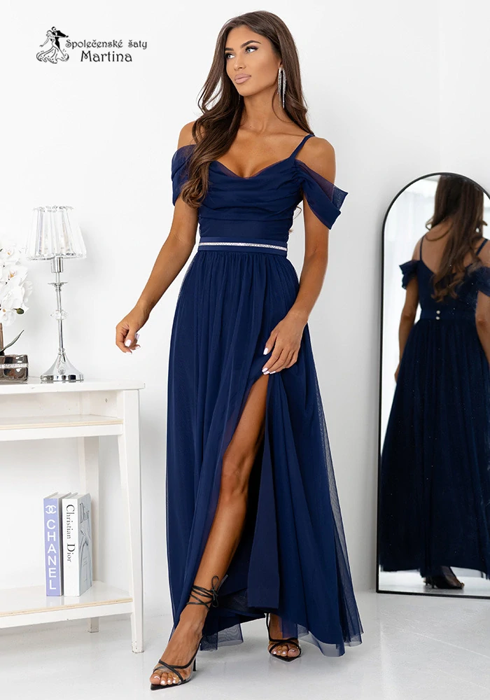 - Tmavě modré tylové společenské šaty "Kiara" s rozparkem a spadenými rameny