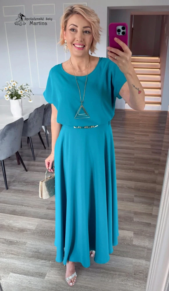 - Tyrkysové společenské šaty "Magnolia" s ozdobným páskem a splývavou sukní