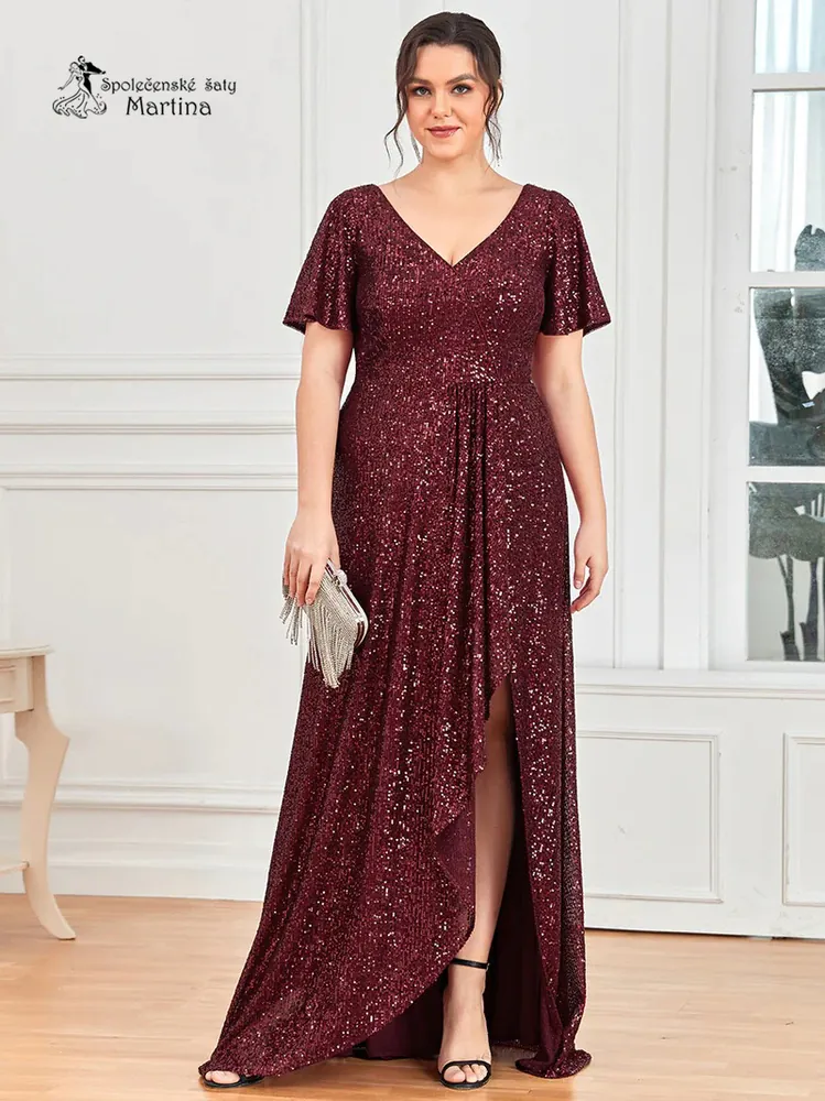 Vínové plus size flitrové večerní společenské šaty "Caris"
