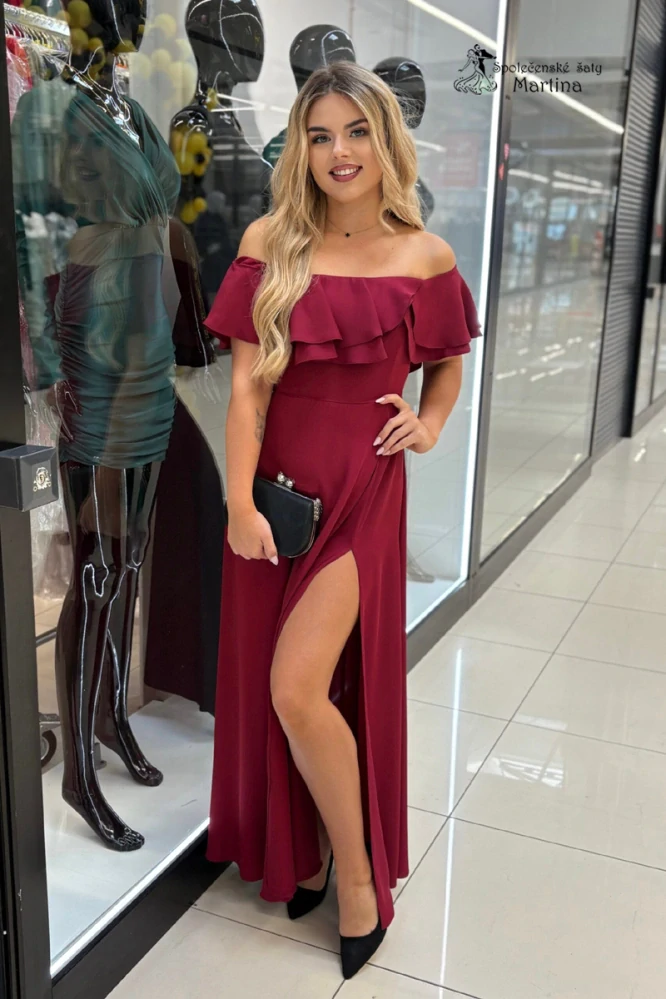- Vínové šaty s volánem "Natalia" s odhalenými rameny a rozparkem