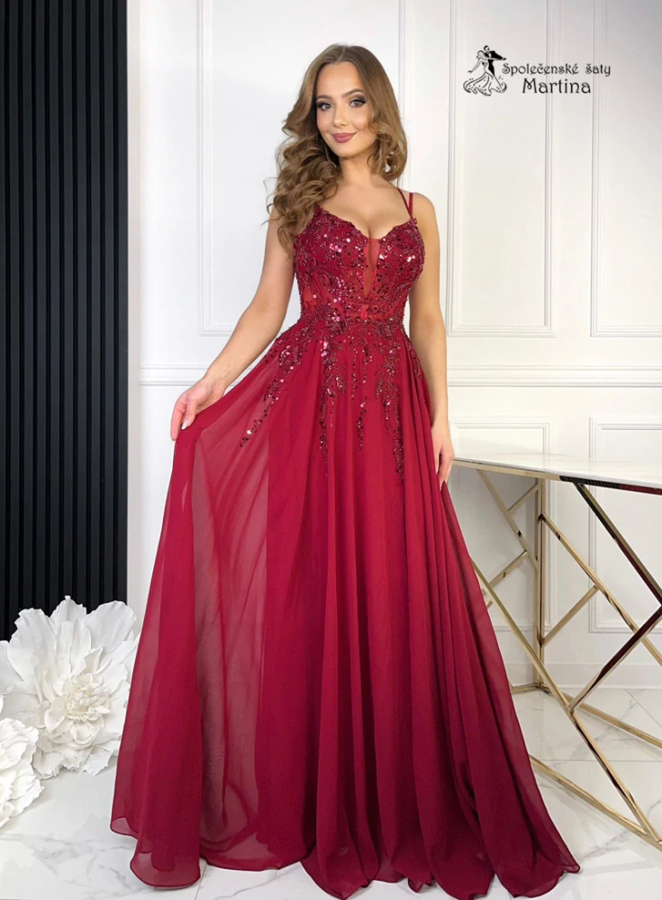 - Vínové šifonové maturitní šaty "Hortenzie" s krajkovým živůtkem a rozparkem - vel. XS