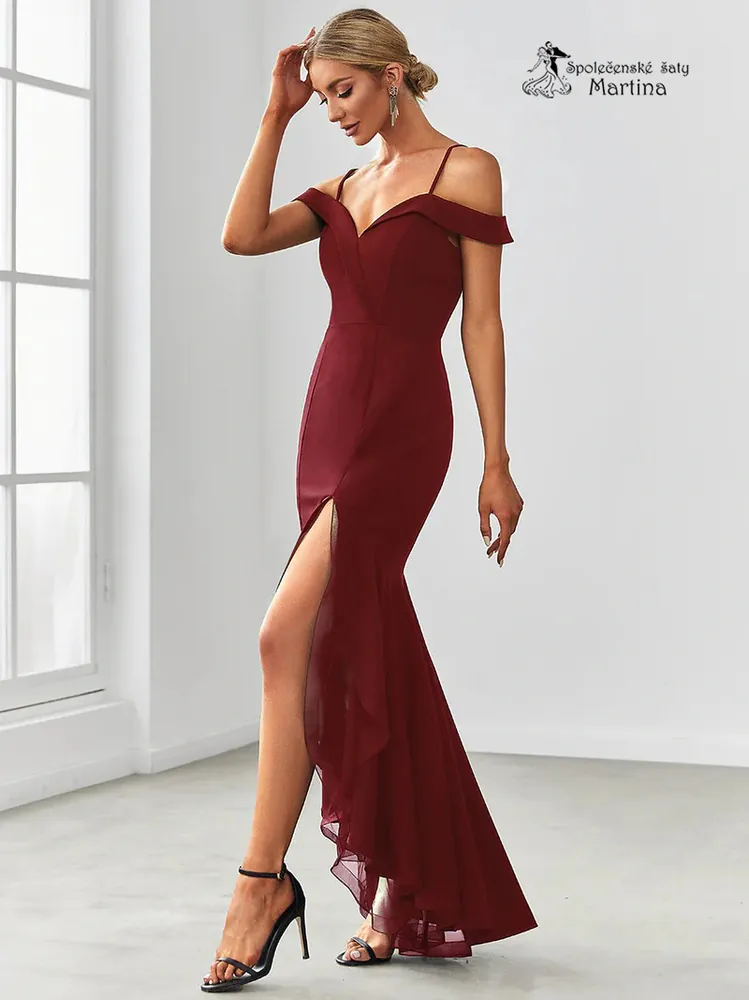 Vínové večerní společenské šaty španělského střihu se spadenými ramínky a rozparkem s volánem "Dolores" - vel. 32/342 400 Kč/ ks1 983 Kč bez DPH