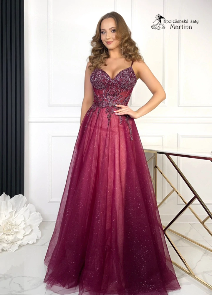 Vínovo-růžové tylové společenské šaty "Lindor" s výšivkou a jemným třpytem4 190 Kč/ ks3 463 Kč bez DPH