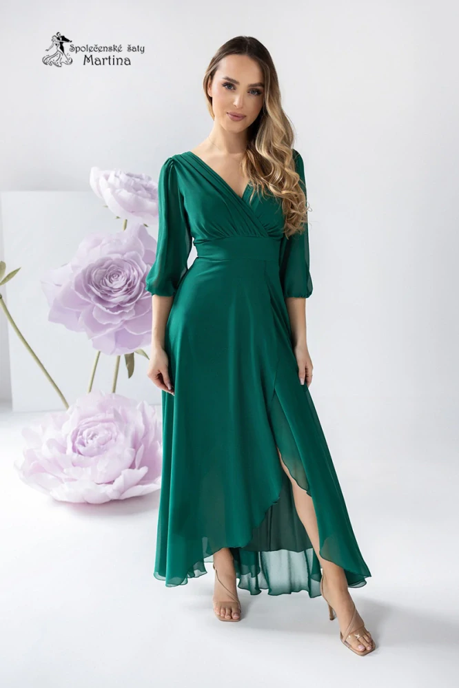 - Zelené dlouhé asymetrické šifonové šaty "Abigail" s ¾ rukávem - vel. 36