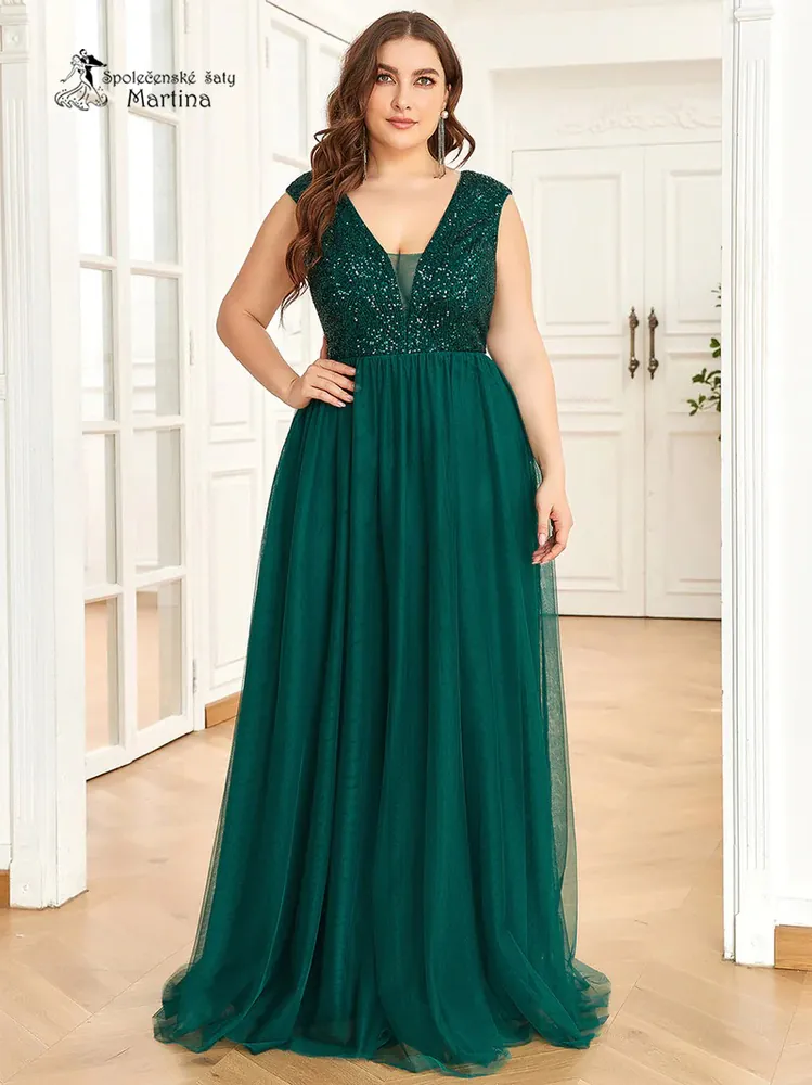 - Zelené tylové šaty "Kaety" s flitrovým živůtkem a širokými ramínky - vel. 52
