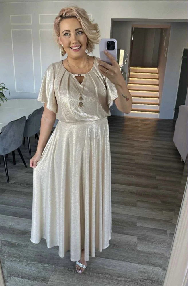 - Zlaté/champagne společenské šaty "Primavera" s třpytivým efektem a širokou sukní - vel. 44